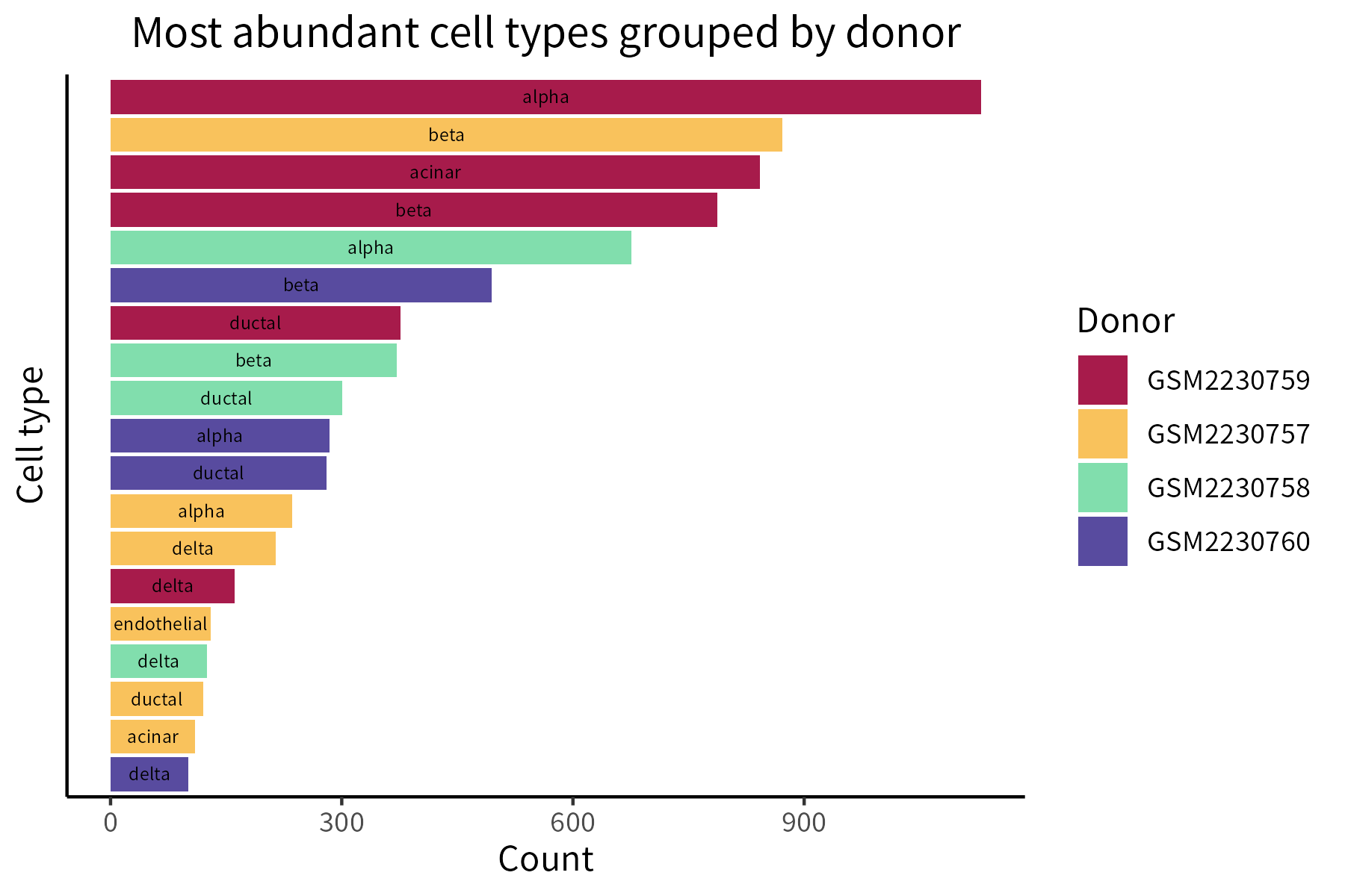 This function creates a bar plot for a set of items grouped by class, ordering the items and classes based on counts. An application is representing data coming from two categorical columns of a scRNA-seq expression object. Here, we render selected donor and label information from the HBP dataset: