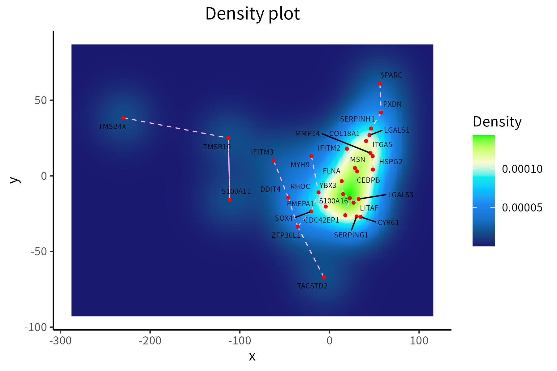 This function creates a density plot for a set of points, optionally displaying segements between each point and its nearest neighbor. We use expression data from the HBP dataset, subjected to a distance matrix calculation and subsequent MDS reduction in order to generate the coordinates of the points: