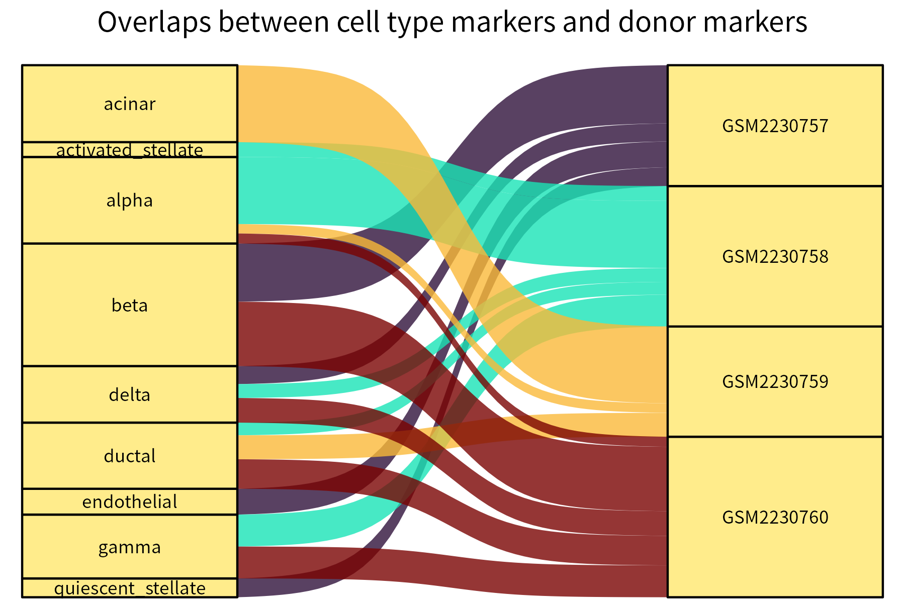 This function generates an alluvial plot for a data frame with two categorical columns and a weights column. As an example, it can represent the significance overlaps between cell type markers and donor markers in the HBP dataset. Stronger overlaps correspond to thicker connecting curves:
