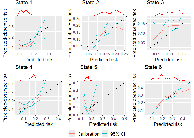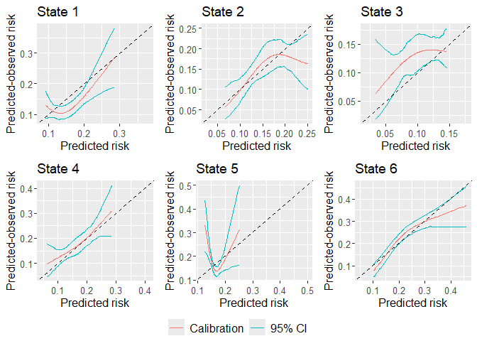 The goal of calibmsm is to provide a set of tools for estimating calibration plots when validating an existing (i.e. previously developed) multistate model. While the vignettes and articles for this package focus on assessing the calibration of a multistate model, calibration plots can also be produced for predicted risks from dynamic models, landmark super models, competing risks models and standard single outcome survival models, where predictions can be made at any landmark time.