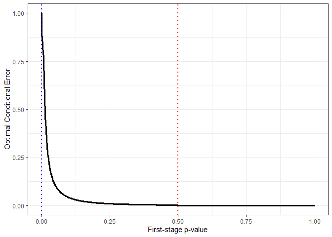 #>   Binding first-stage futility boundary (p-value scale): 0.5
