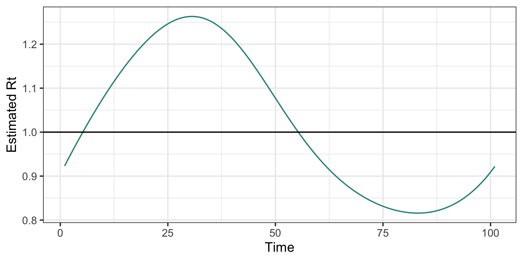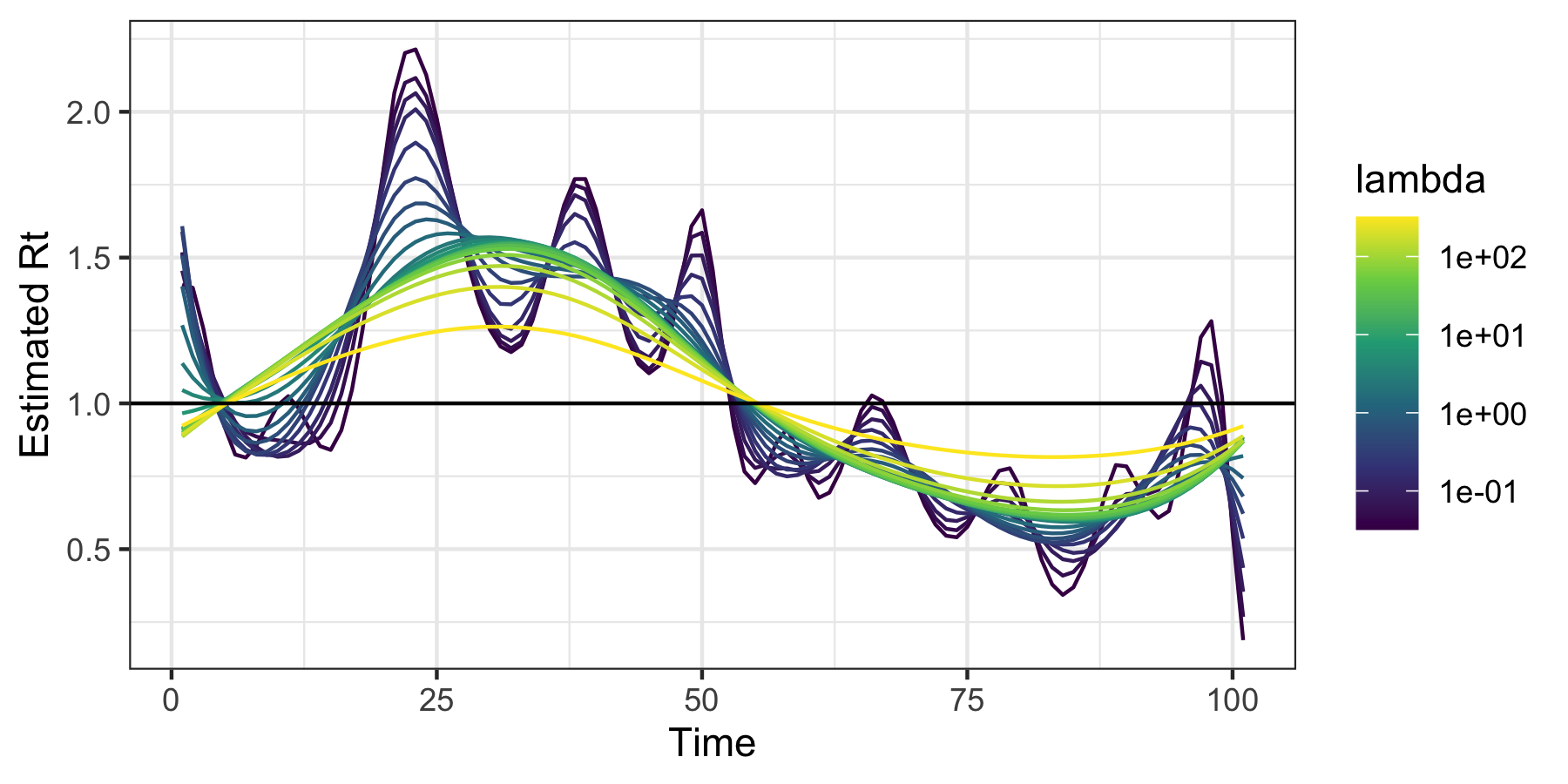 This package uses Poisson likelihood with a trend filtering penalty (a type of regularized nonparametric regression) to estimate the effective reproductive number, Rt. This value roughly says “how many new infections will result from each new infection today”. Values larger than 1 indicate that an epidemic is growing while those less than 1 indicate decline.